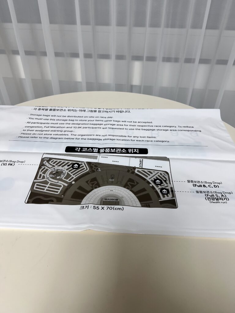 배번호표 뒤에는 RFID칩이 붙어있고 물품보관백에는 대회 물품을 맡길수 있는 장소나 유의사항에 대해 프린팅이 되어 있어